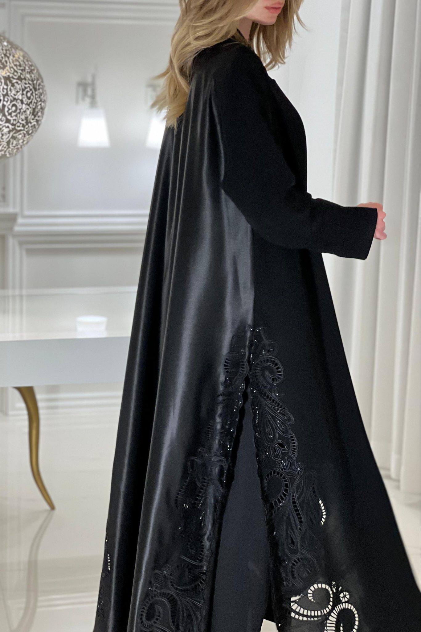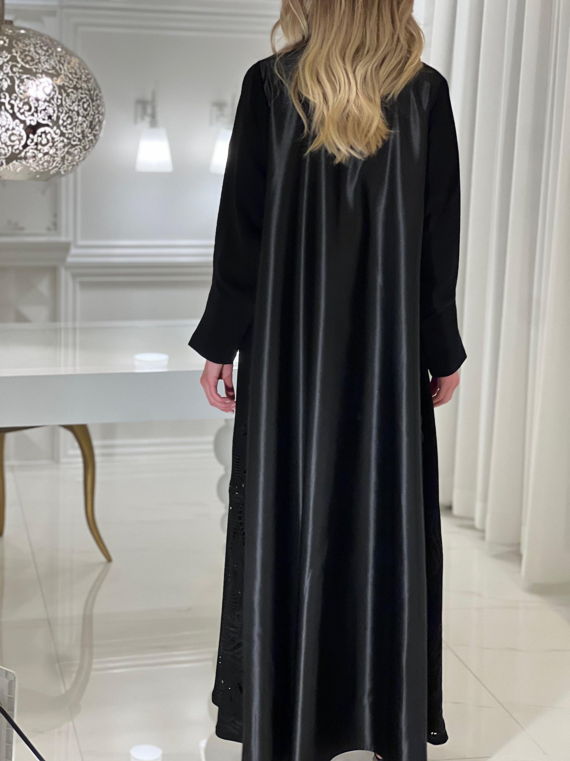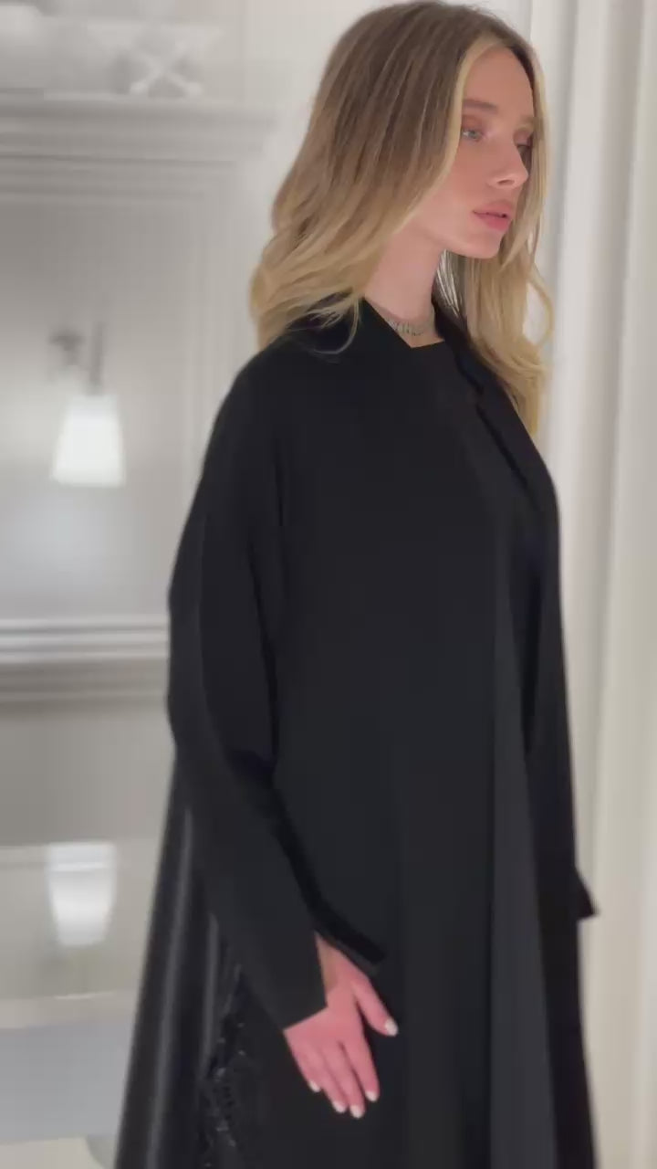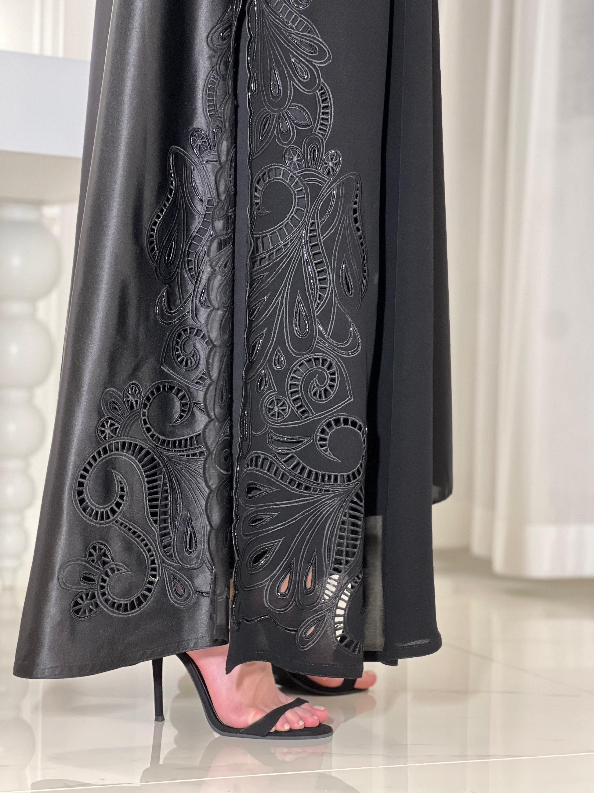 Graceful, timeless, and effortlessly feminine—the Hue Abaya is designed for the woman who carries elegance in every step. Crafted from a luxurious blend of Italian Taffeta and Crepe, it drapes beautifully while maintaining a structured silhouette. The delicate hand-embroidered details and intricate cutwork along the hem add a soft yet refined touch, making it perfect for both grand occasions and everyday sophistication.
