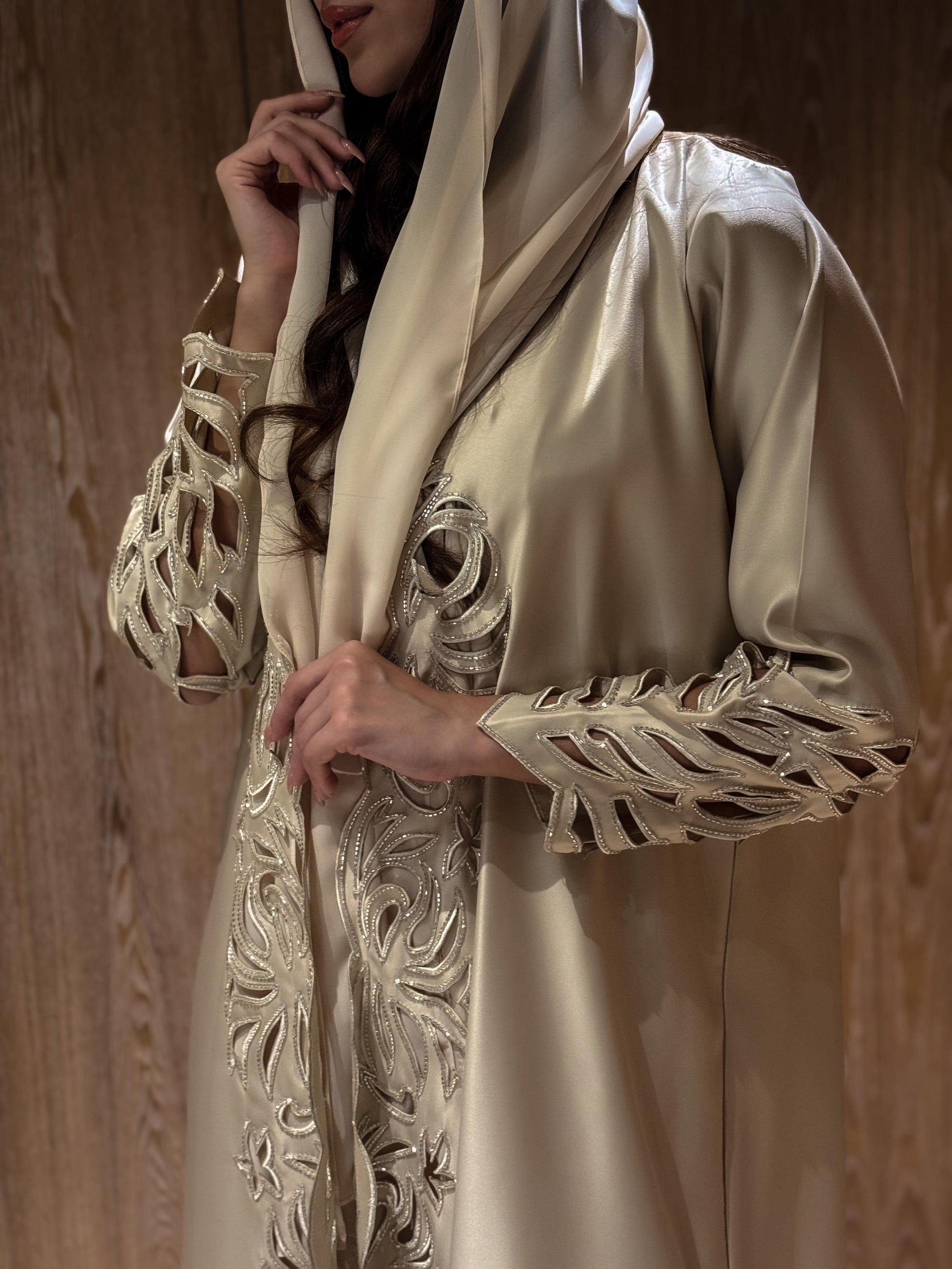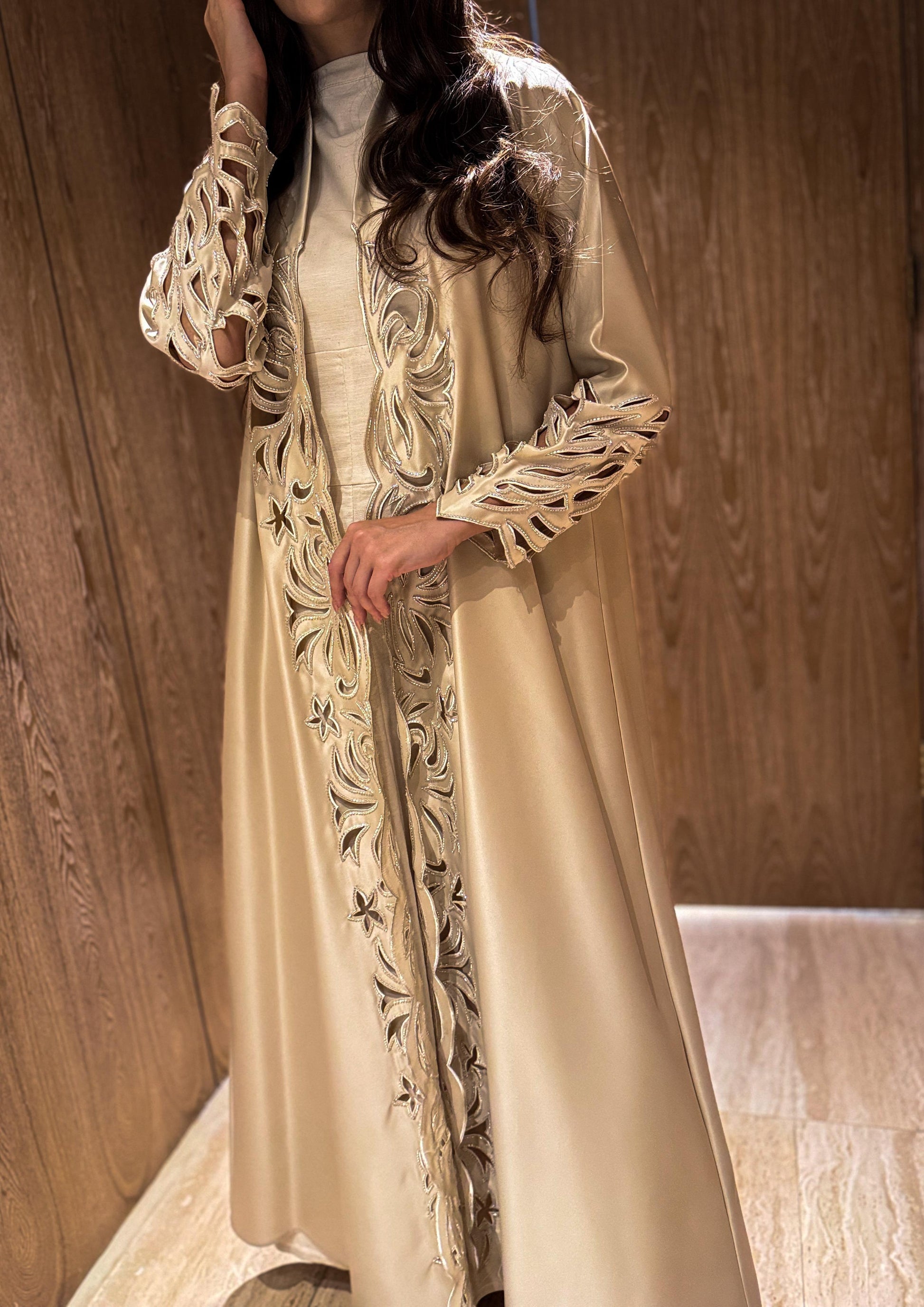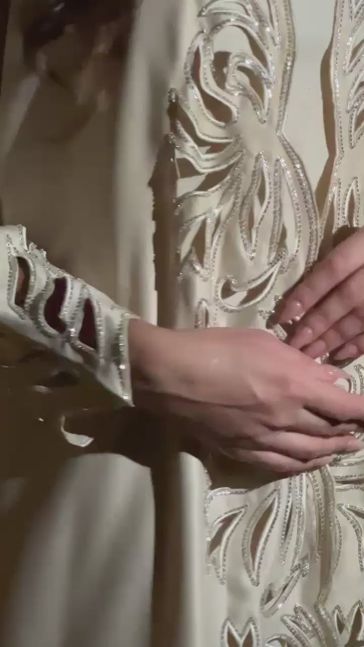 Crafted from luxurious silky taffeta, Reine features exquisite hand embroidery that showcases exceptional artisanal skill. The fabric's natural sheen catches light beautifully, highlighting the intricate needlework while providing a structured yet elegant drape. This premium garment requires professional care to maintain its superior quality—dry clean only to preserve its distinctive texture and detailed embellishments.