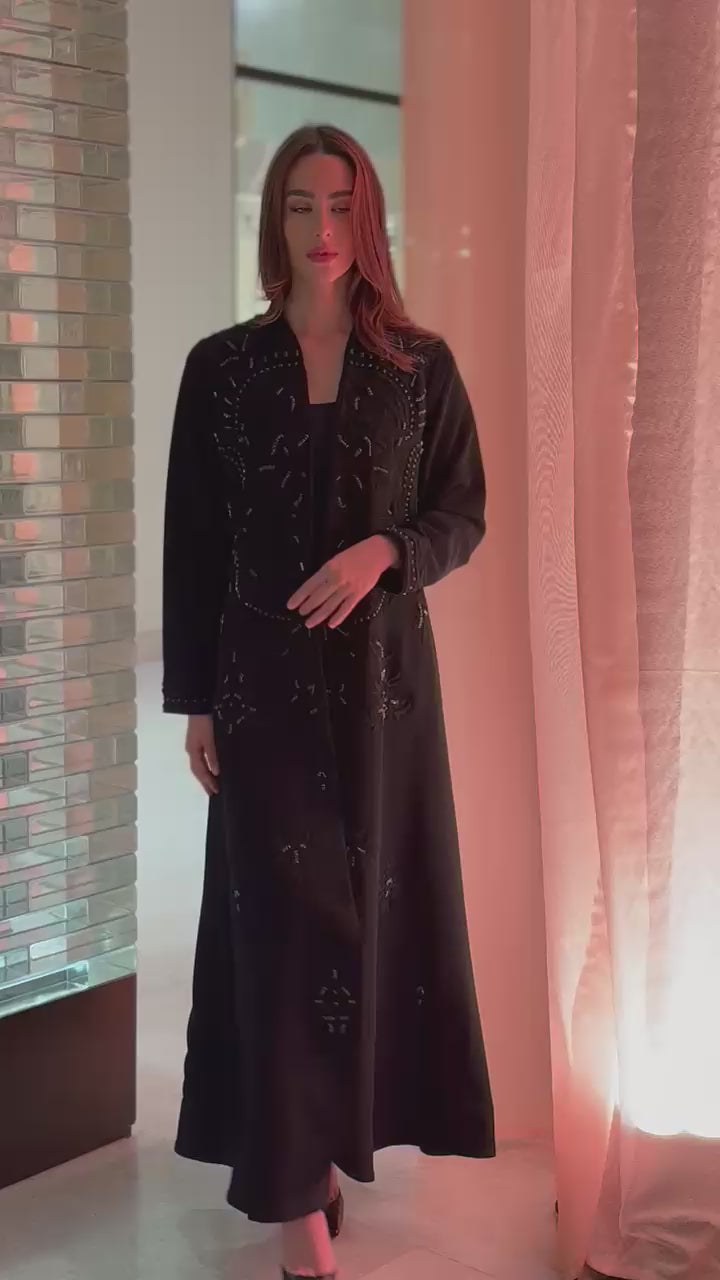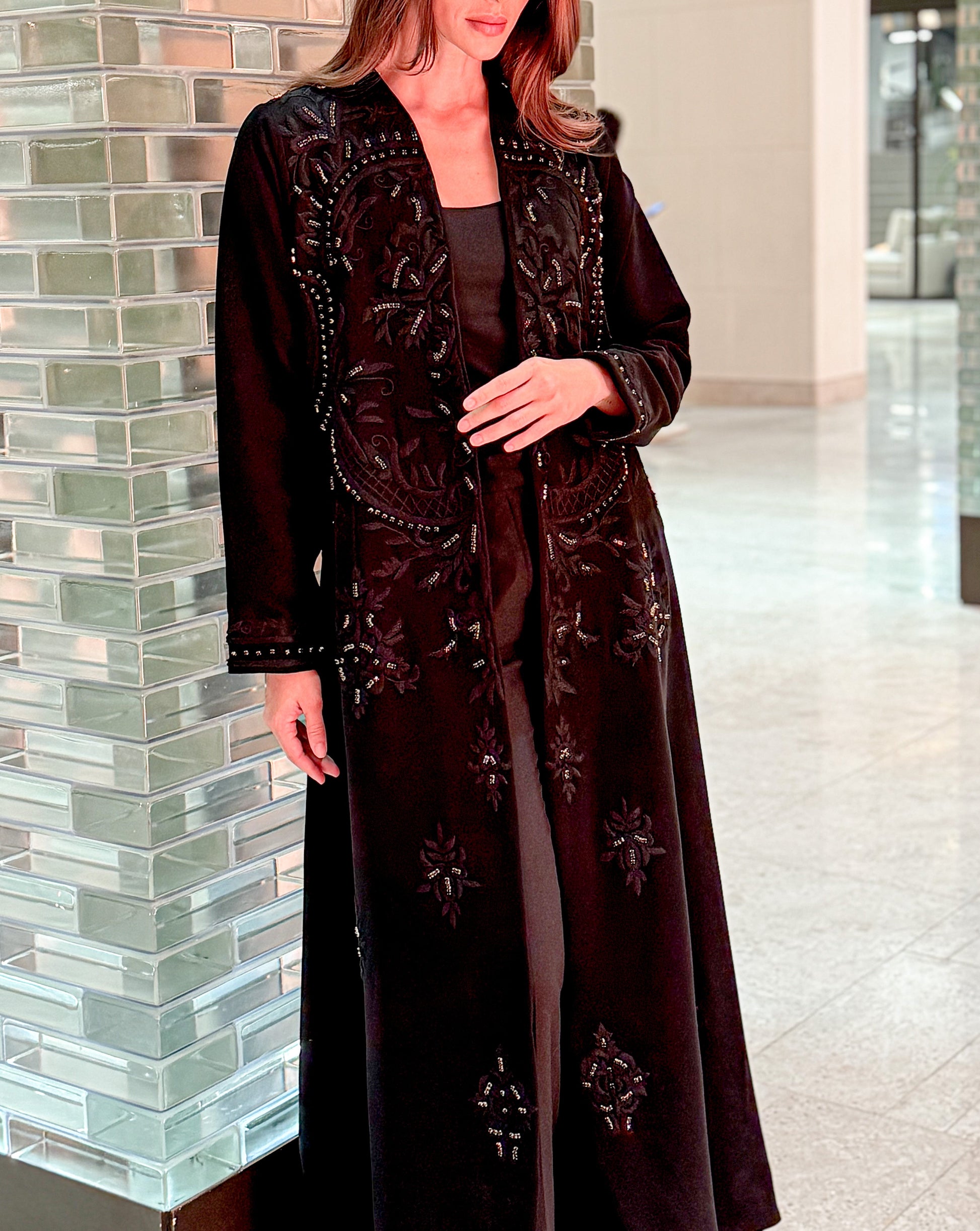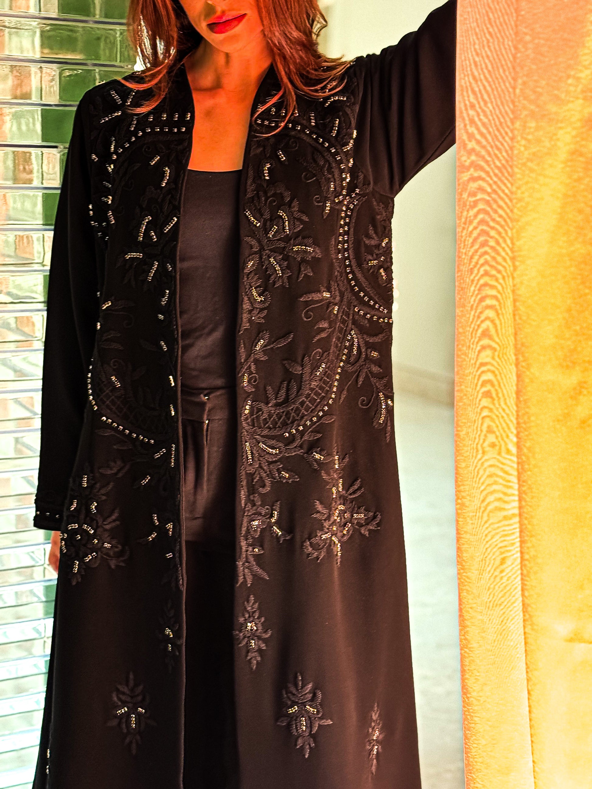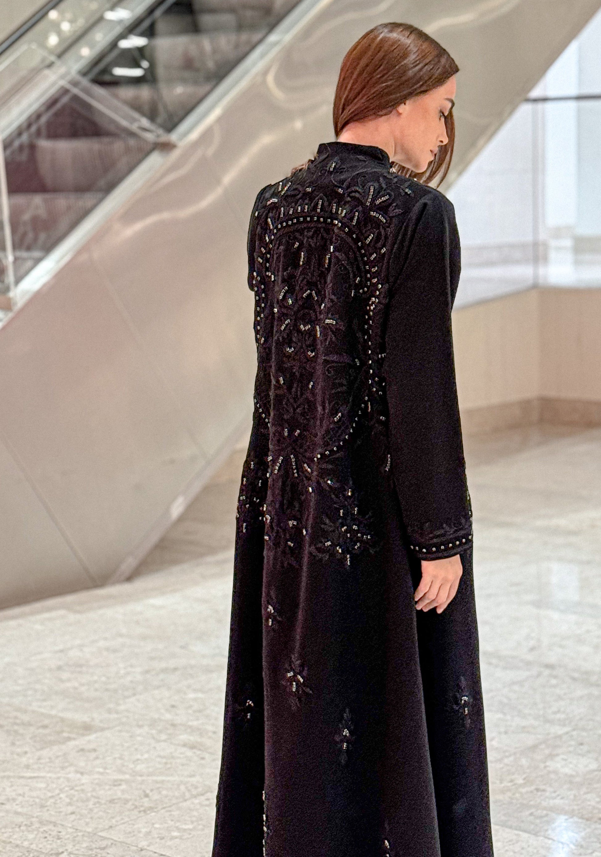 Crafted from luxurious Japanese Crepe, Reine features exquisite hand embroidery and beading that showcases exceptional artisanal skill. The fabric's natural flow catches light beautifully, highlighting the intricate needlework while providing a structured yet elegant drape. This premium garment requires professional care to maintain its superior quality—